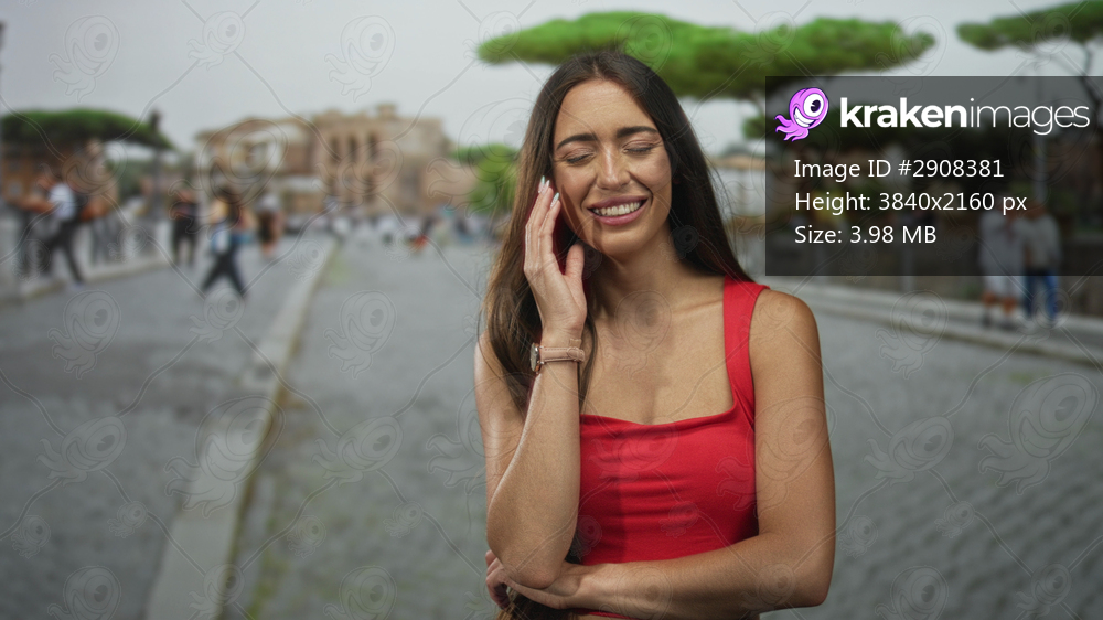 Woman smiling with hand to cheek and bare shoulder on a cobblestone street; happiness confidence leisure.