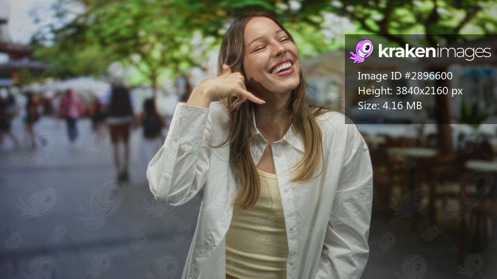Woman smiling with hand to ear in call gesture on street terrace outside restaurant wearing casual shirt and tanktop; playful joy.