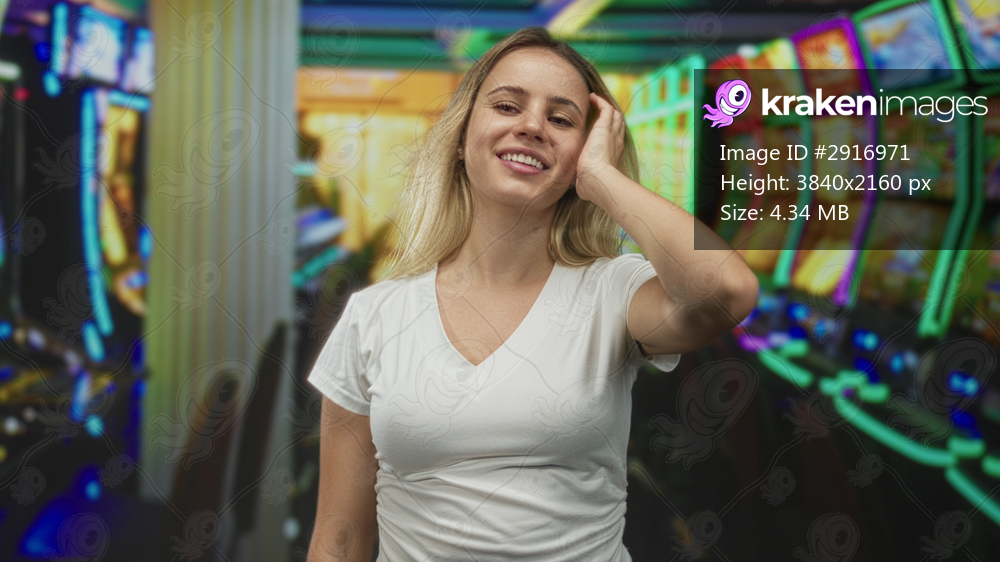 Woman smiling with hand to hair beside brightly lit slot machines in casino building, wearing white tshirt and casual pose; happy leisure.