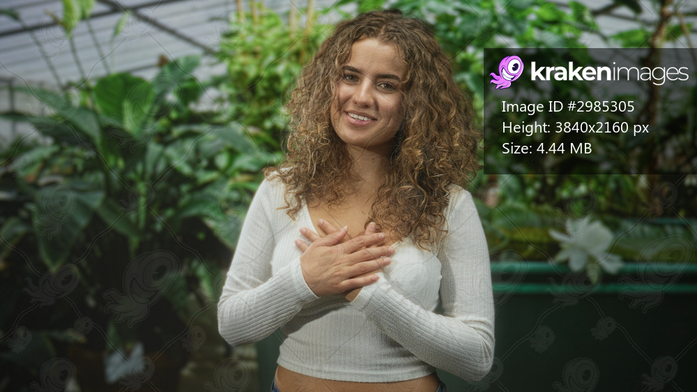 Woman smiling with hand to hair showing cleavage in a greenhouse building among large potted plants and a white flower; serenity.