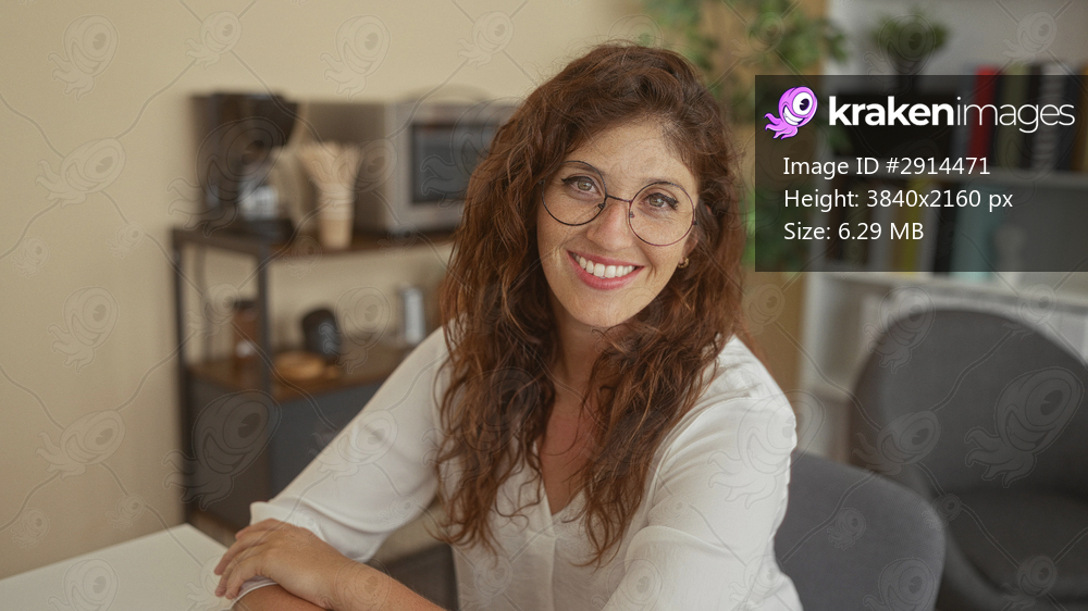 Woman smiling, hand to hair, wearing round glasses while seated at desk with bookshelf and chair in studio; friendly confidence.