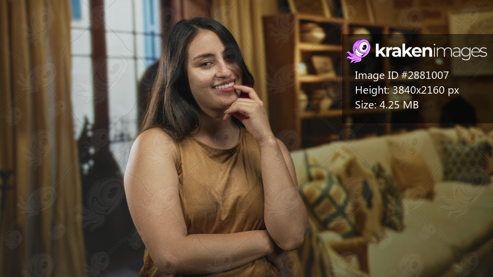 Woman smiling with hand to mouth gesture standing by sofa in living room building; warm contentment.