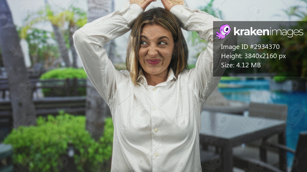 Woman smiling with hands above head showing face and white shirt at resort poolside patio with palm trees; summer joy.