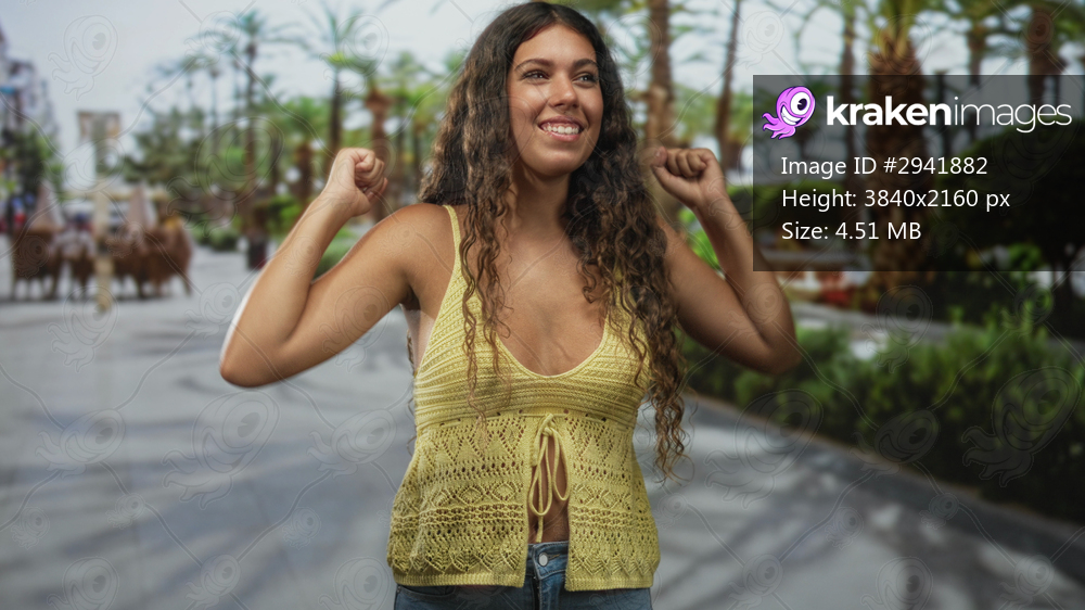 Woman smiling with hands at hair and raised arms on a sunlit palm lined street promenade; joy carefree.