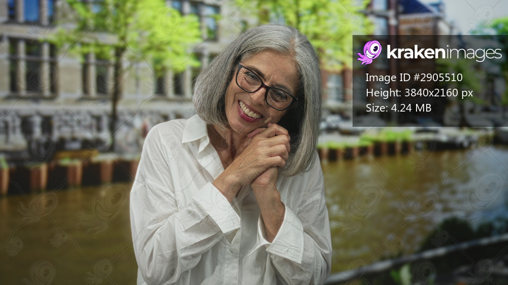 Woman smiling with hands clasped, glasses visible, standing by canal and historic building in amsterdam; serenity.