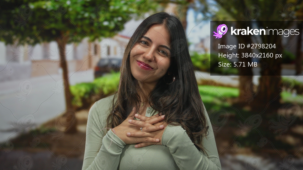 Woman smiling with hands clasped in a serene green park setting showcasing natural beauty and tranquility outdoors in daylight.