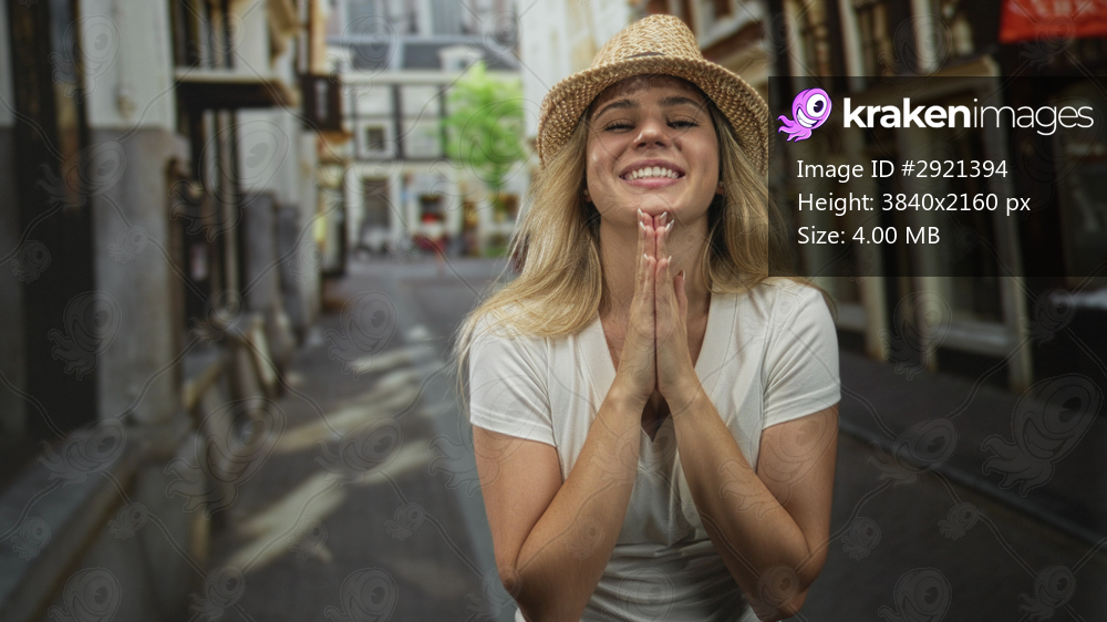 Woman smiling with hands clasped in prayer on a cobbled city street between shops and buildings, wearing straw hat and white tee; joy gratitude travel. - Kraken Images