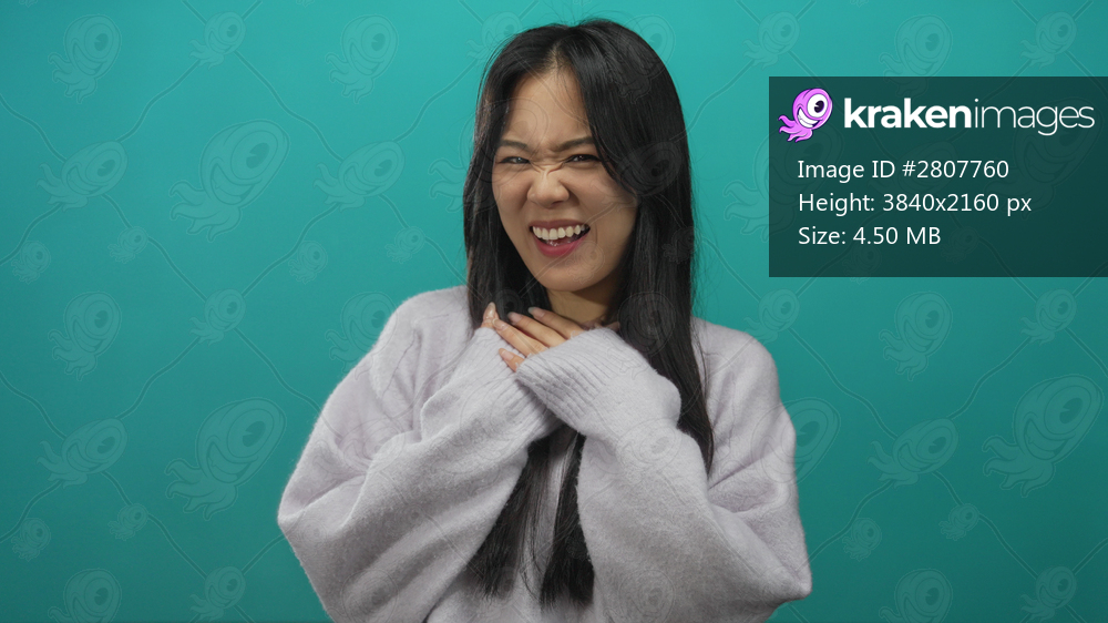 Woman smiling with hands clasped over isolated blue background displaying cheerful and surprised expressions in an indoor setting showcasing genuine emotion and personality. - Kraken Images