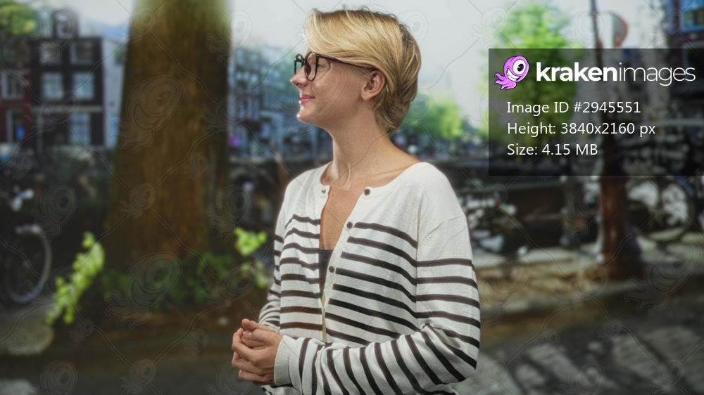 Woman smiling with hands clasped and right palm raised in a presenting gesture on street by canal; friendly welcome.