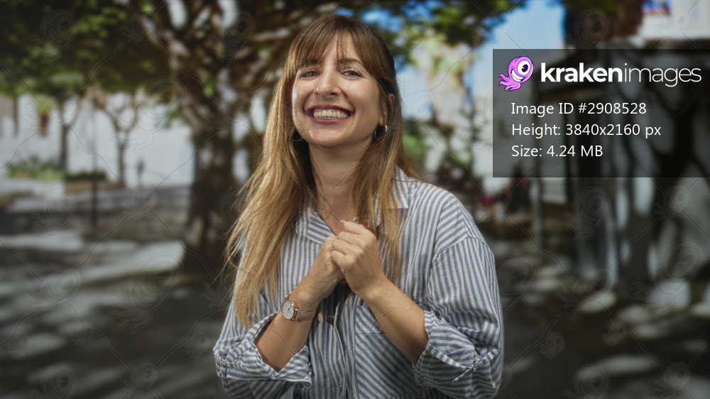 Woman smiling with hands clasped to chest on a street lined with trees and buildings; gratitude connection.