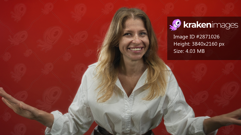 Woman smiling with hands crossed in denial gesture in red studio wearing white shirt and belt; gratitude calm.