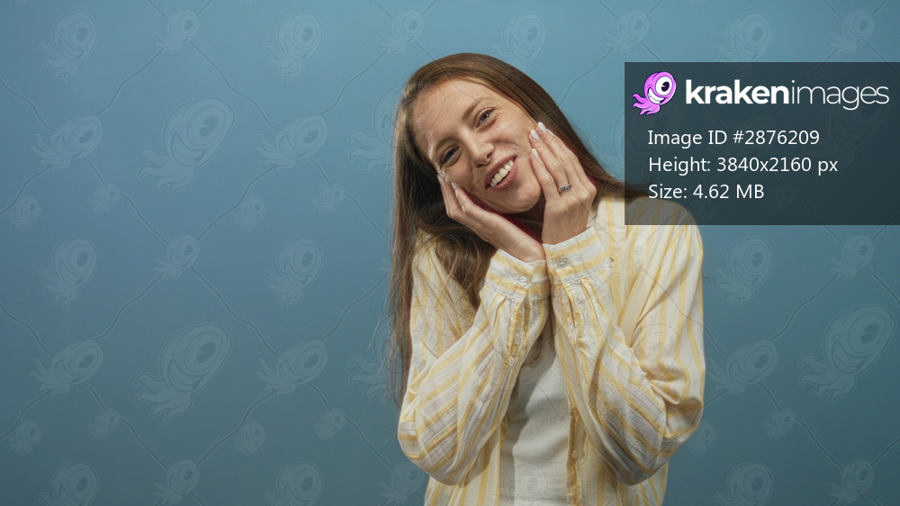 Woman smiling with hands cupping face and closed eyes in studio against a blue backdrop wearing a striped shirt; joyful warmth.