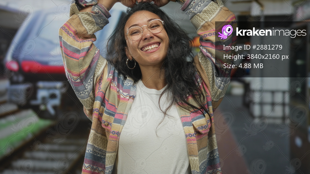 Woman smiling with hands forming heart shape above head at train station building platform; joy connection warmth.