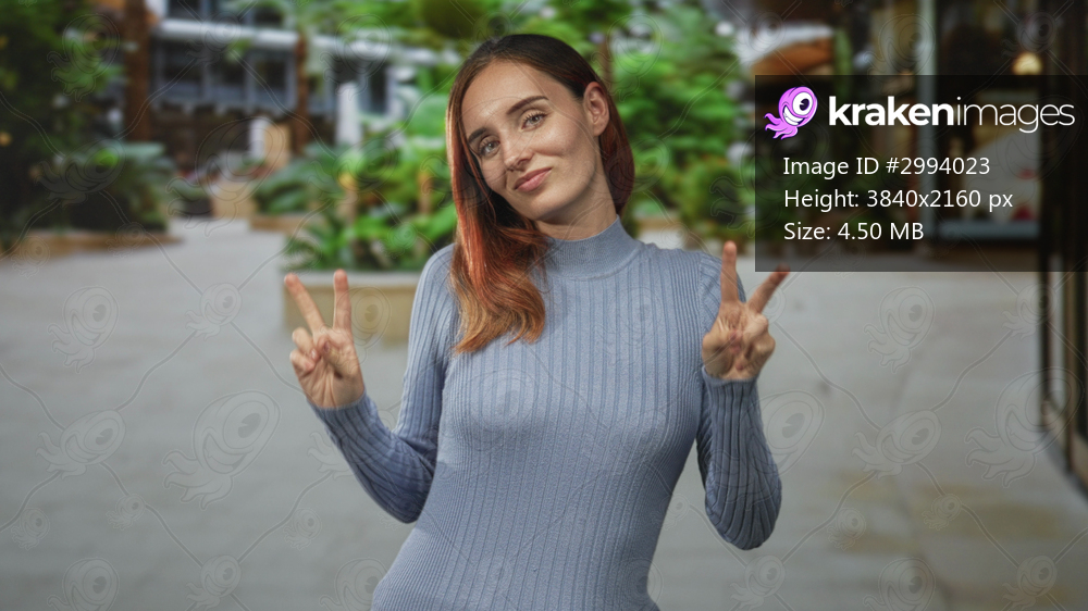 Woman smiling with hands forming peace signs and tilted head, visible face and hands, standing on a street with planters and storefronts; quiet contentment. - Kraken Images