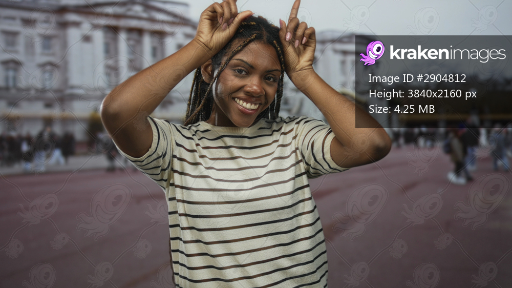 Woman smiling with hands forming playful horns gesture in front of large historic building on outdoor plaza; playful joy.