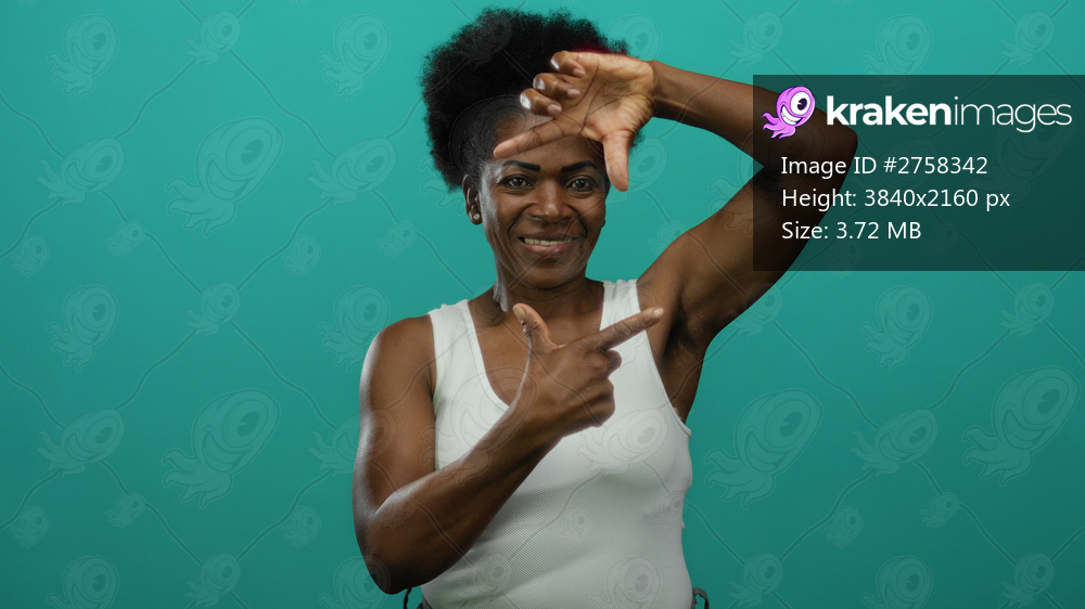 Woman smiling with hands framing face against isolated green background wearing white tank top, expressive joyful gesture captured in vibrant studio setting. - Kraken Images