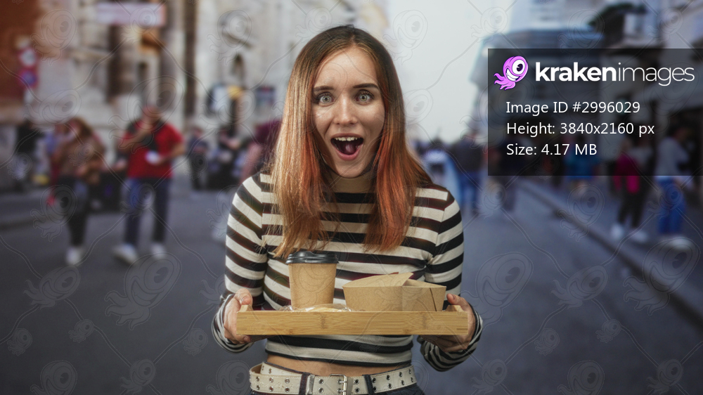 Woman smiling, hands holding a wooden tray with coffee cup and takeaway boxes on a busy street with blurred pedestrians and buildings; cheerful hospitality. - Kraken Images