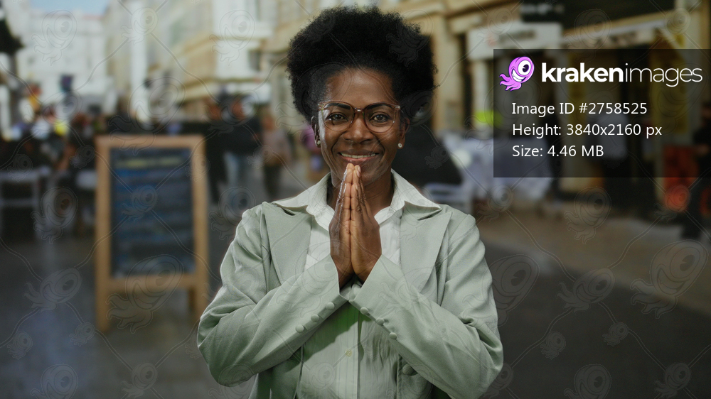 Woman smiling with hands in prayer gesture on city street wearing glasses and suit displaying joy and gratitude in sunlight outdoors with cafes and shops in view. - Kraken Images