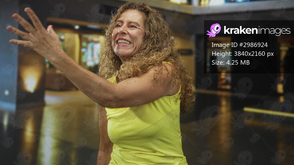 Woman smiling with hands near face and arms raised in a building interior wearing a yellow sleeveless top and necklace; joy gratitude connection.