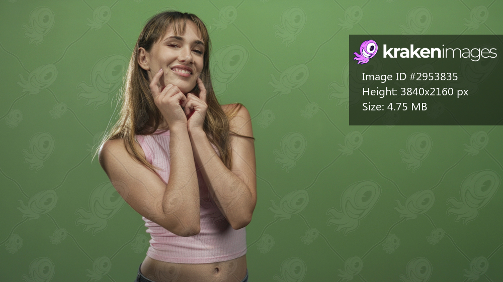 Woman smiling with hands near face and bare midriff in green studio wearing pink crop top, closed eyes pose; joy.