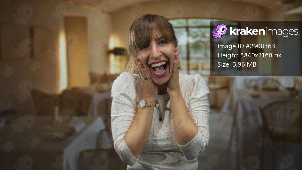 Woman smiling with hands on cheeks in a restaurant building, leaning forward toward camera while seated at table; joy celebration.