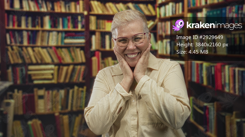 Woman smiling with hands on cheeks and pointing at camera in a building library aisle; joy friendly warmth.