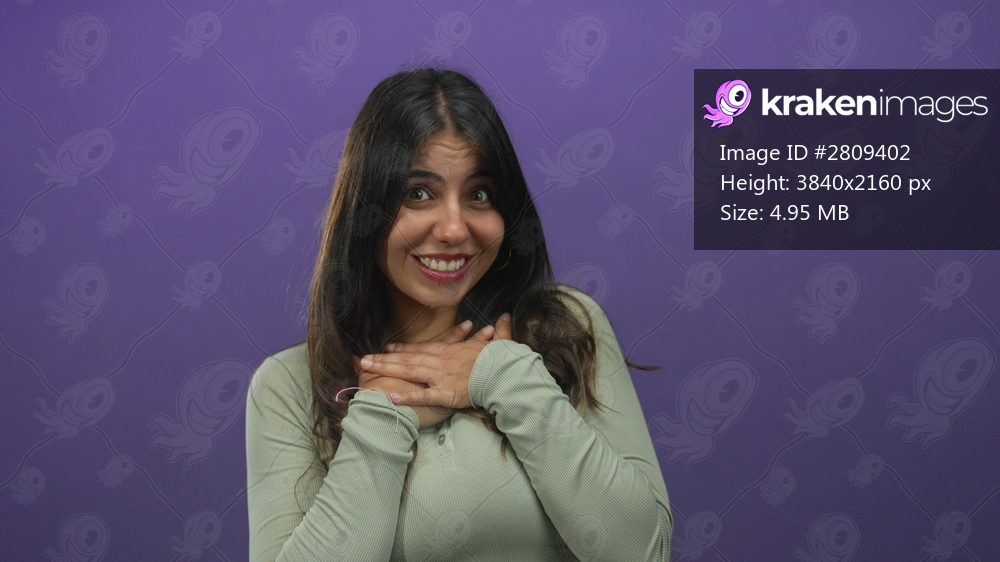Woman smiling with hands on chest against purple background expressing gratitude and joy, showcasing positive emotion and sincerity on an isolated setting. - Kraken Images