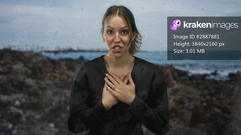 Woman smiling with hands on chest at studio near rocky seaside, laughing and looking surprised; surprise response.