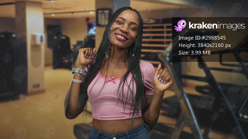 Woman smiling with hands on chest, exposed midriff and braided hair in a fitness studio with treadmills and machines visible; self confidence joy.