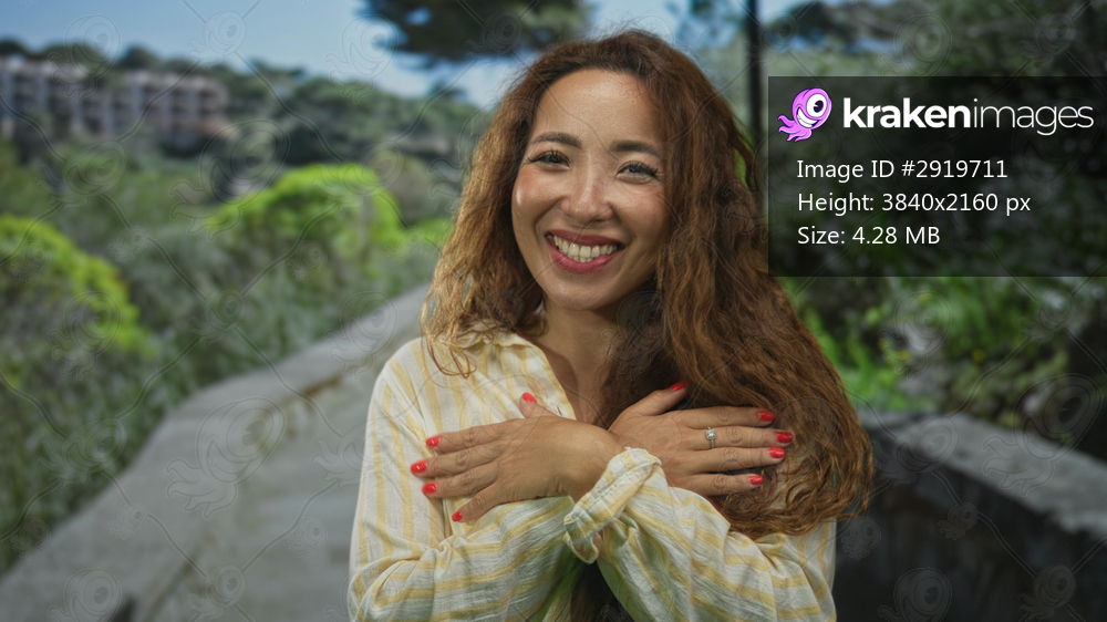 Woman smiling with hands on chest and long wavy hair on a forest path by green trees and stone wall; gentle joy.