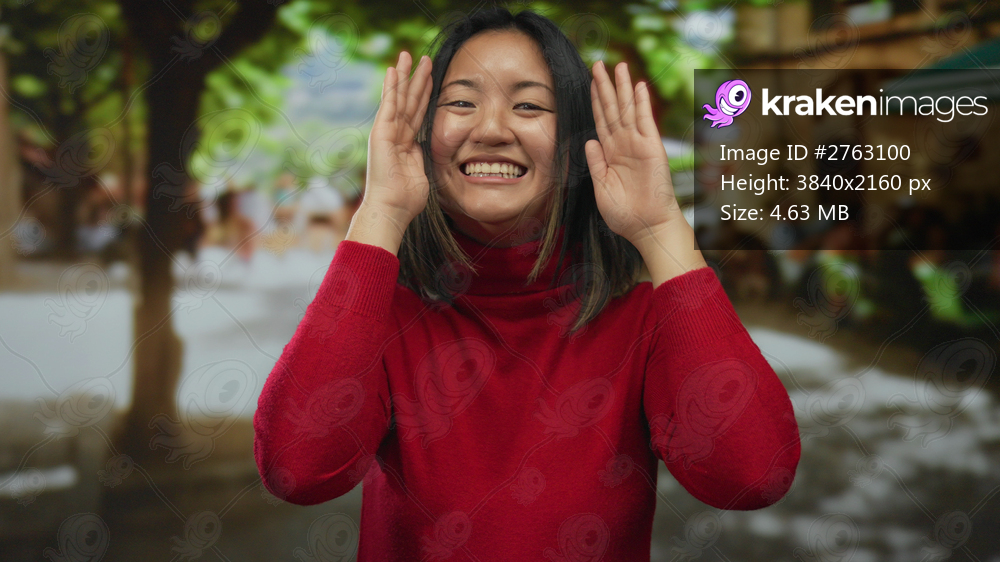 Woman smiling with hands on face in city street surrounded by blurred urban background on a sunny day.