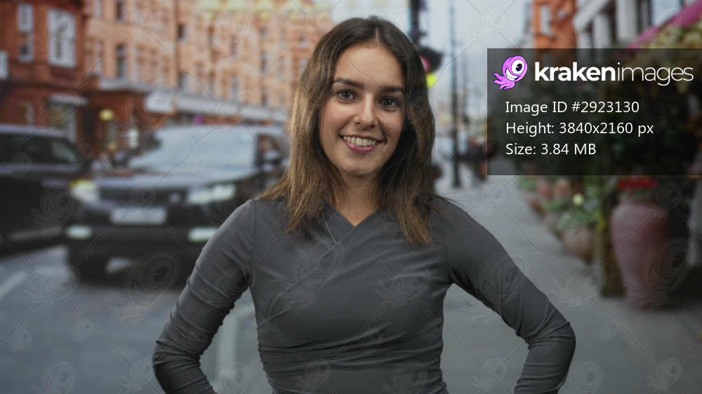 Woman smiling with hands on hips and direct gaze on city street amid parked cars and planters; confidence urban.