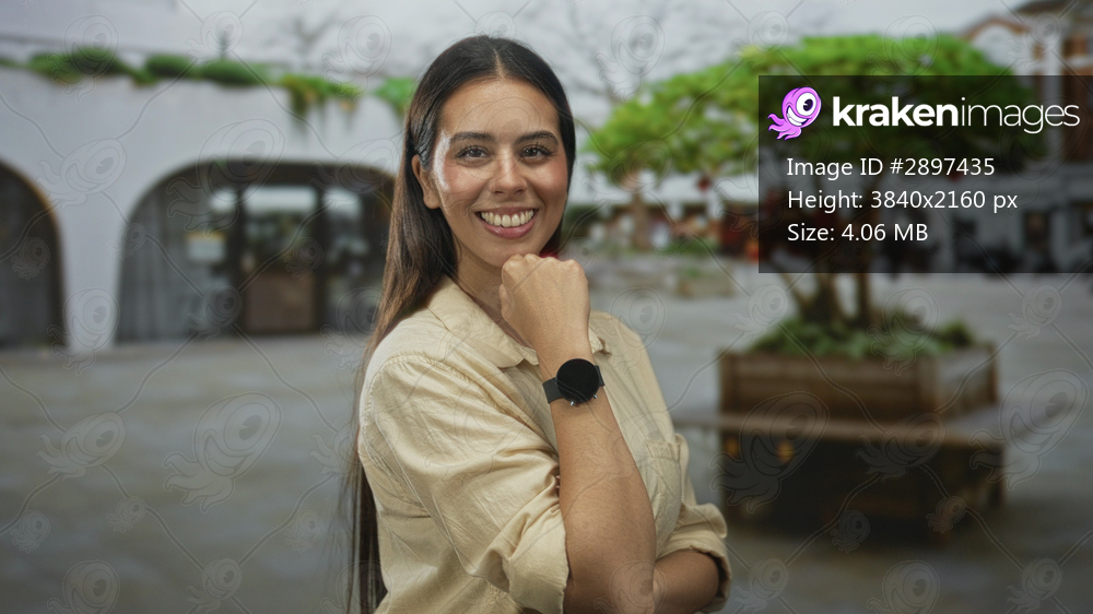 Woman smiling with hands on hips and gesturing near wristwatch in street plaza by a building entrance; confidence.