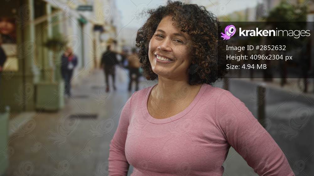 Woman smiling with hands on hips in casual attire on lively street under warm sunlight; calm confidence.
