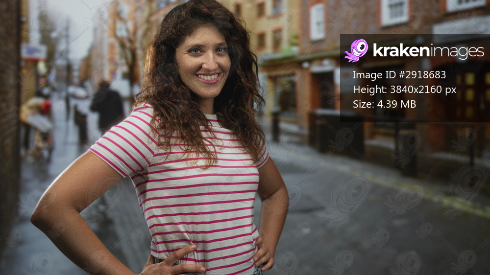Woman smiling with hands on hips on a rainy street lined with brick buildings, looking at camera; confidence urban.