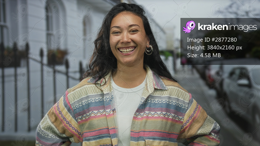 Woman smiling with hands on hips on street in city neighborhood wearing striped jacket and hoop earrings; joyful confidence.