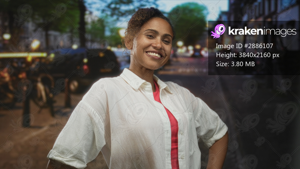 Woman smiling with hands on hips wearing white shirt and red top on a city street under lampposts at night; confidence empowerment resilience.