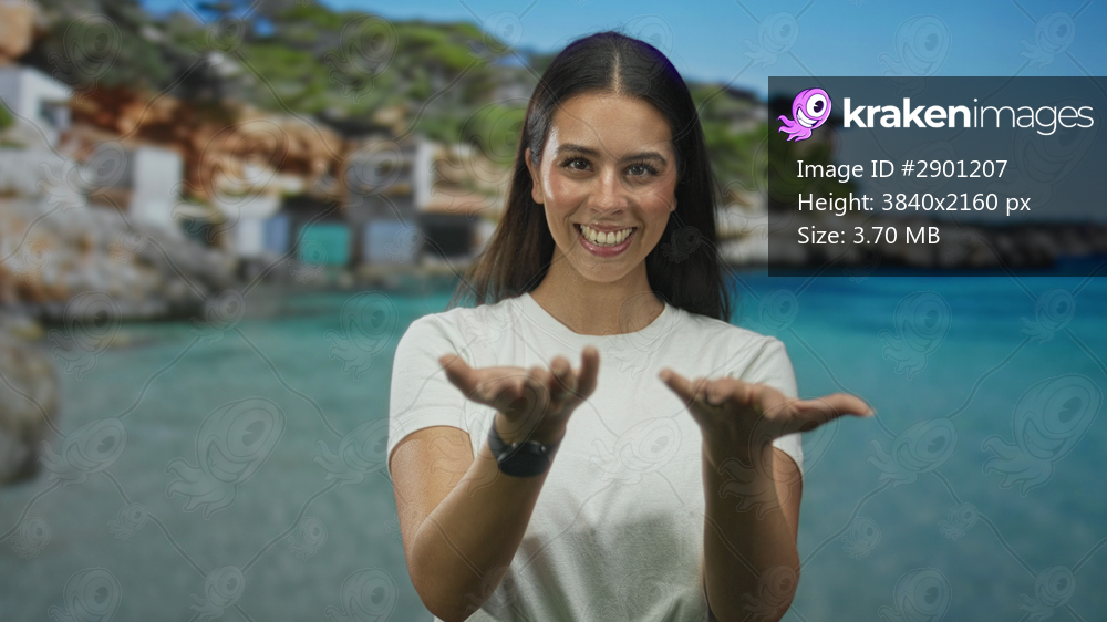 Woman smiling with hands open showing palms and watch in a studio seaside set; joy summer travel.