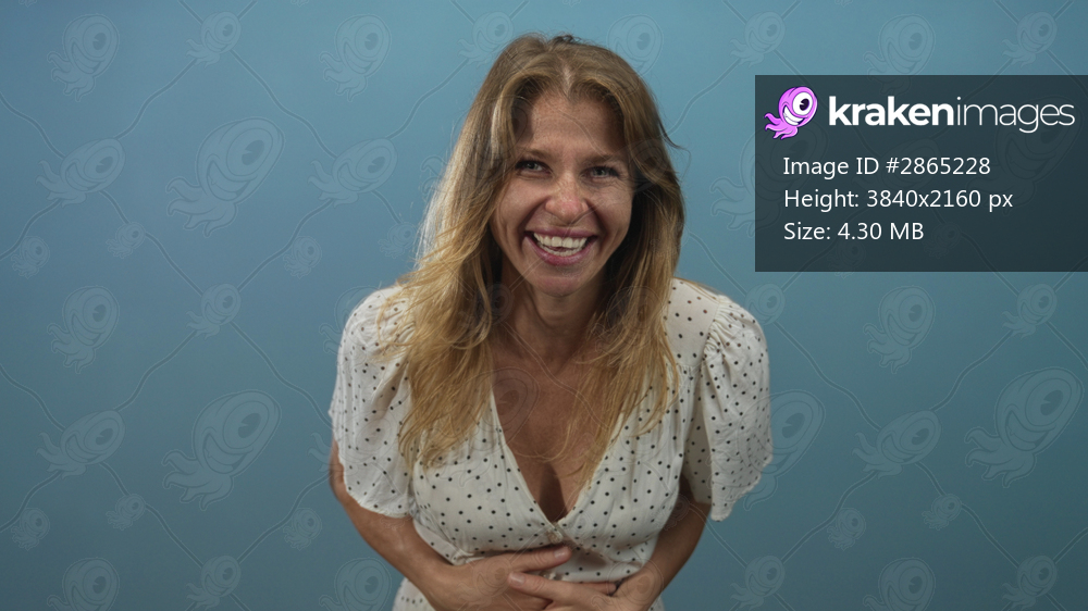 Woman smiling with hands over mouth, laughing and leaning forward in studio with blue backdrop wearing white polka dot dress; joy surprise.