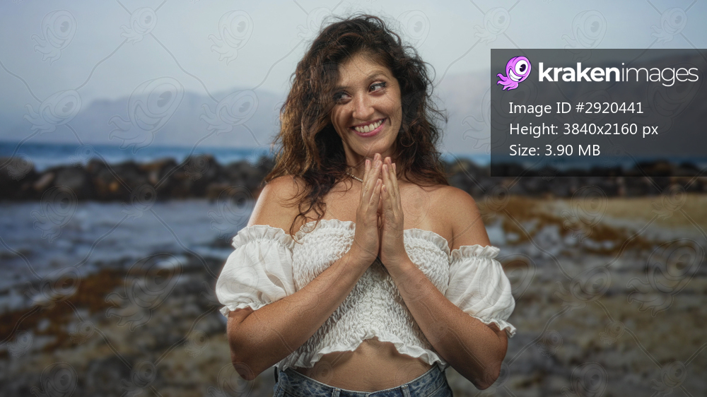 Woman smiling with hands pressed together and exposed shoulders on a coastal shore by rocky breakwater in a studio setting; gratitude reflection.