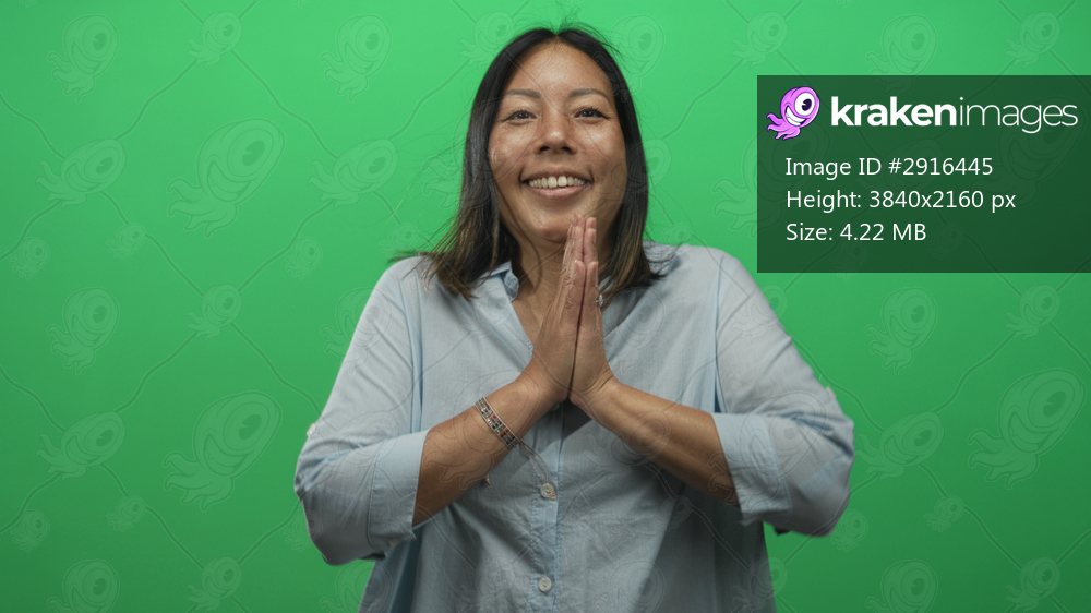 Woman smiling with hands pressed together in prayer gesture in a green studio set; gratitude mindfulness.