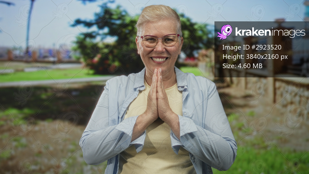 Woman smiling with hands pressed together in prayer gesture, wearing glasses and a light shirt on a sunny street by a green park and stone fence; gratitude. - Kraken Images