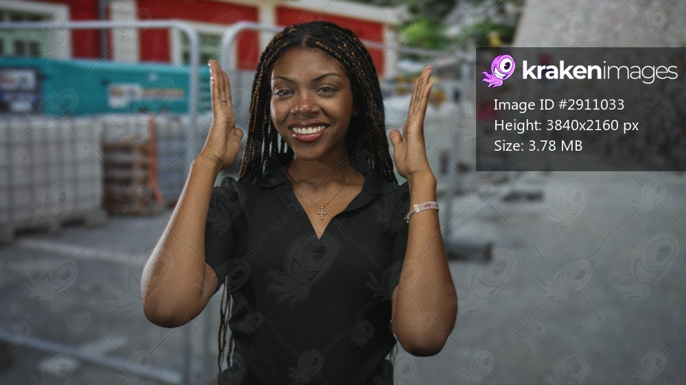 Woman smiling with hands raised by head at construction building, wearing black top and cross necklace; joy empowerment resilience.
