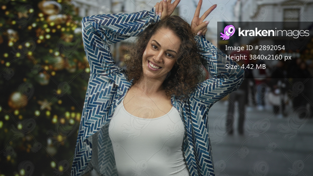 Woman smiling with hands raised making bunny ears beside decorated christmas tree on a busy street; playful holiday.