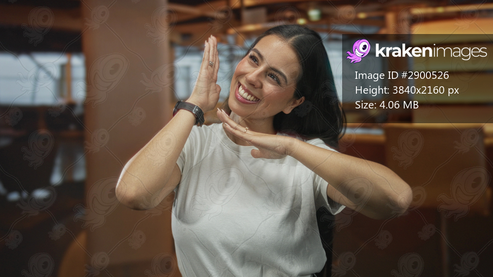 Woman smiling with hands raised near face in a restaurant building, young brunette wearing white tshirt and smartwatch; joy.