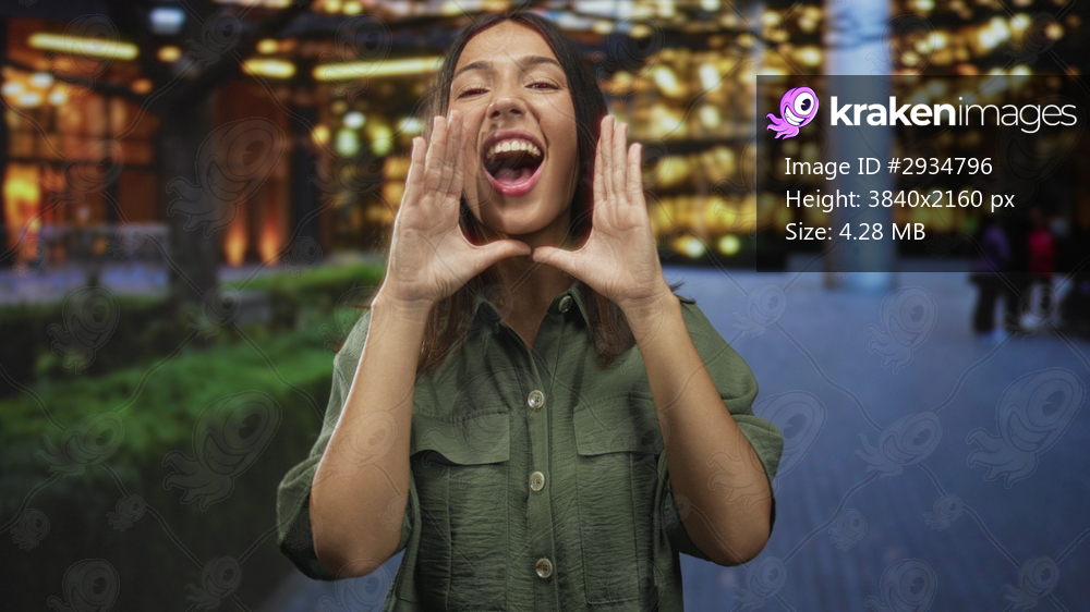 Woman smiling with hands raised near her face showing forearms, wearing green shirt, standing in front of illuminated building on a street plaza; joyful confidence. - Kraken Images