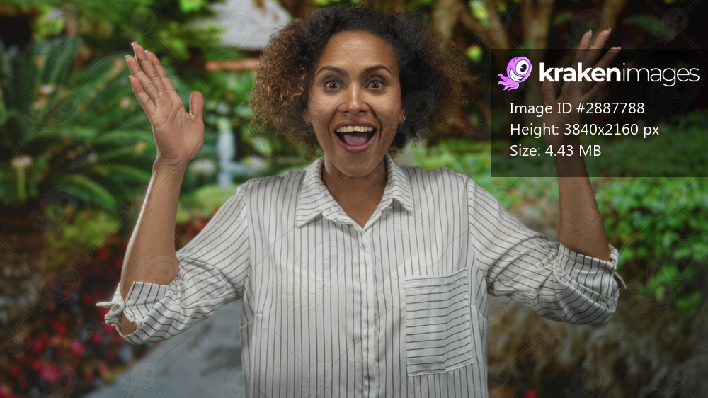 Woman smiling with hands raised and open palms in a forest setting among greenery and park foliage, wearing a striped shirt; joy celebration.