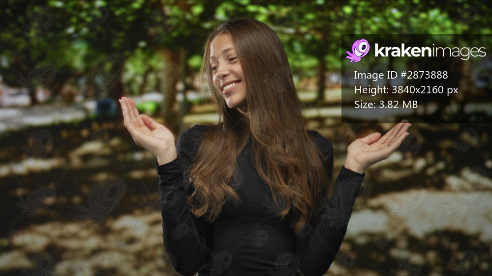 Woman smiling with hands raised palms up showing shrug gesture in sunny green park wearing black top, trees and path visible; cheerful.