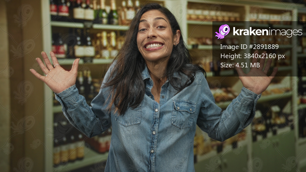 Woman smiling with hands raised and palms visible in a supermarket aisle inside a building; joy celebration.
