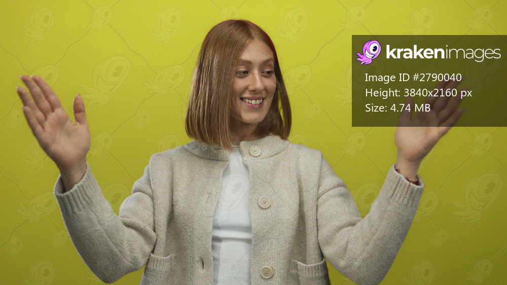 Woman smiling with hands raised wearing a cozy sweater against a vibrant yellow background conveying joy and positivity.